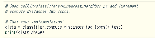 설명에 나와있듯이 cs231n/classifiers폴더에 있는 k_nearest_neighbor.py 파일의 compute_distances_two_loops 함수의 일부를 작성해야 한다.