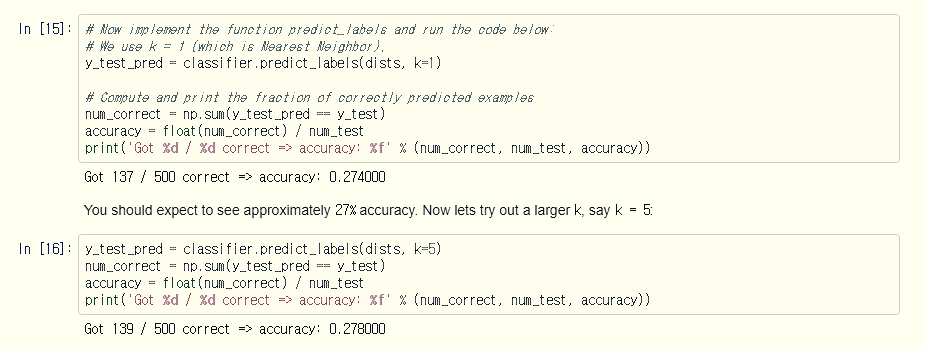 다음과 같이 predict_label 함수를 수정하고 나면 위에 보는것처럼 27%정도의 accuracy를 확인할 수 있을것이다.