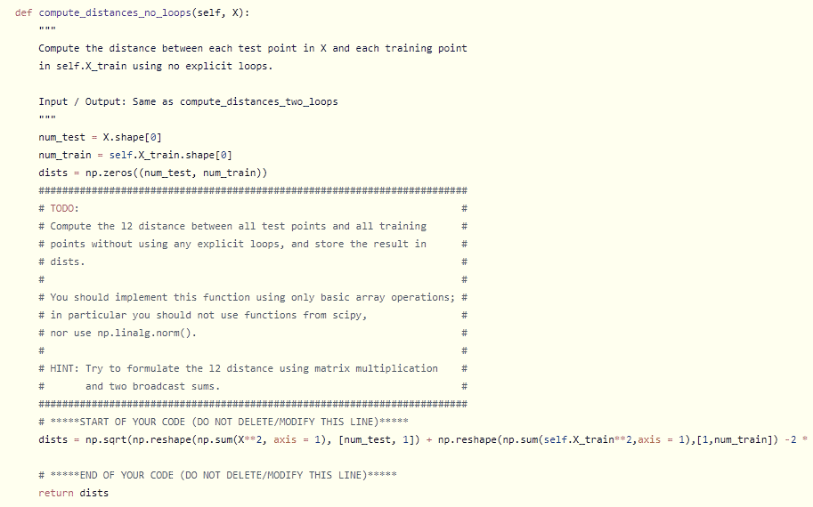 dists = np.sqrt(np.reshape(np.sum(X**2, axis = 1), [num_test, 1]) + np.reshape(np.sum(self.X_train**2,axis = 1),[1,num_train]) -2 * np.matmul(X,self.X_train.T)) 이것이 전체 코드이다.