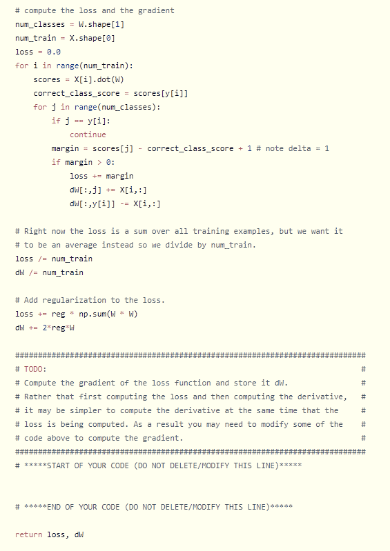 해당 함수에서 우리가 작성해야 할 부분은 loss function의 gradient인 dW를 구하는 것이다.