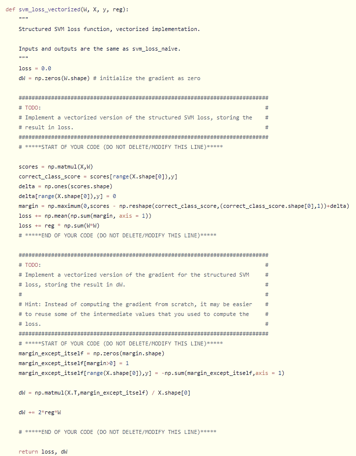 이후 loss를 구하기 위해 margin을 먼저 구하는데 이 margin과 fixed margin(delta)와는 다른것이므로 구분이 필요하다. margin을 보두 구한 뒤 각 행을 모두 더해 loss를 구하고 regularization을 해주면 된다. dW를 구하는 부분도 위에서 했던 loss_naive 함수를 참고하면 간단하게 작성할 수 있다.