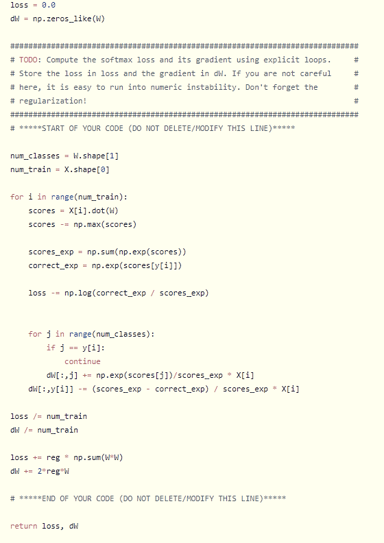 scores를 구하는 부분은 SVM과 같다. 하지만 위의 TODO부분을 보면 If you are not careful here, it is easy to run into numeric instability. 라는 부분이 있다. 주의하지 않으면 numeric instability에 빠질 수 있다. 라는 의미인데 cs231n의 lecture note를 보면 다음과 같은 설명을 찾을 수 있다.