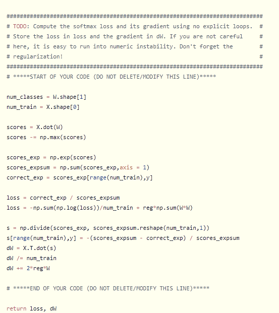 scores를 구하는 부분은 SVM과 같다. 하지만 위의 TODO부분을 보면 If you are not careful here, it is easy to run into numeric instability. 라는 부분이 있다. 주의하지 않으면 numeric instability에 빠질 수 있다. 라는 의미인데 cs231n의 lecture note를 보면 다음과 같은 설명을 찾을 수 있다.