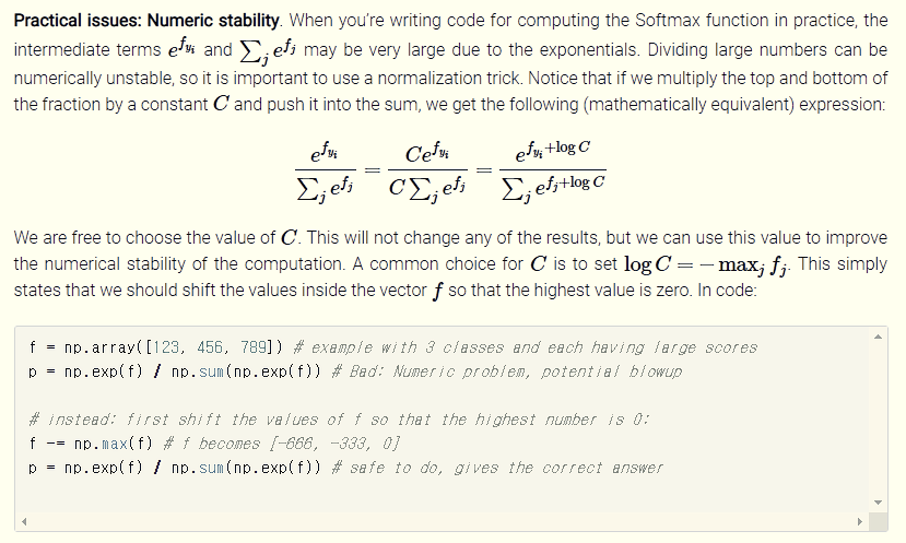 위의 내용에서 볼 수 있듯이 numerical stability를 향상시키기 위해서는 f값들 중 최댓값을 f에서 빼는 방법을 사용할 수 있다.